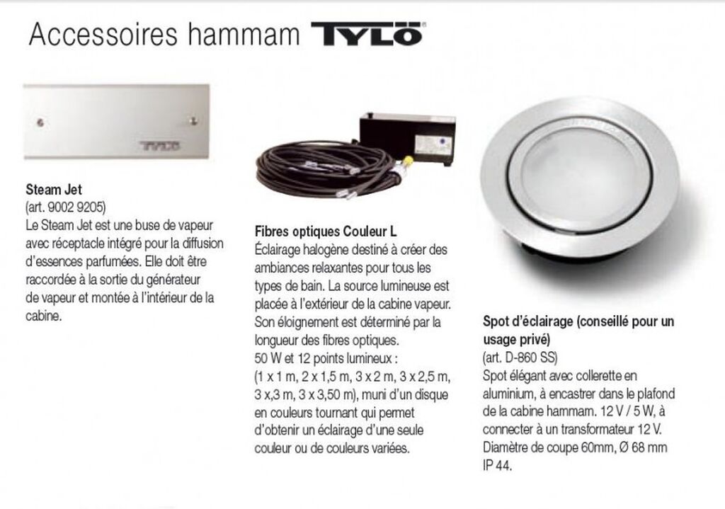 Éclairage halogène destiné à créer des ambiances relaxantes pour tous les types de bain. La source lumineuse est placée à l’extérieur de la cabine vapeur.Son éloignement est déterminé par la longueur des fibres optiques.