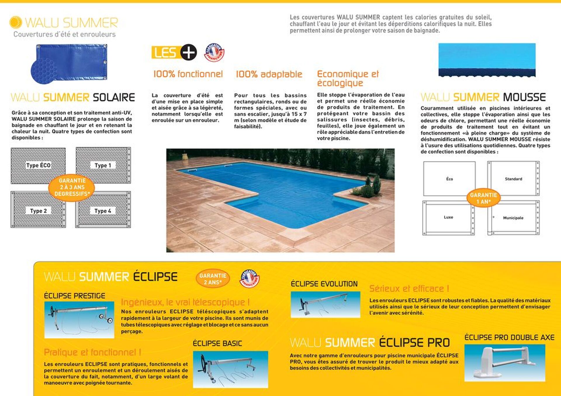 La couverture Walu Summer Mousse évite les déperditions calorifiques la nuit et réduit l'hygrométrie en espace intérieur. Elle réduit les odeurs de chlore et permet une réelle économie de produits de traitement. Elle soulage le système de déshumidification. Elle est adaptée aux bassins rectangulaires, avec ou sans escalier. Elle est couramment utilisée en piscines intérieures ou collectives. Elle s'adapte aux piscines entérrées et piscines hors-sol.