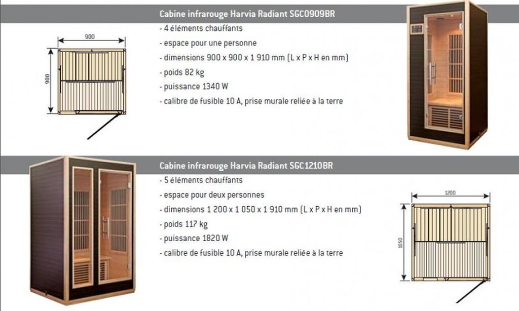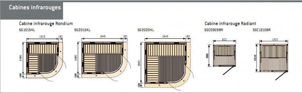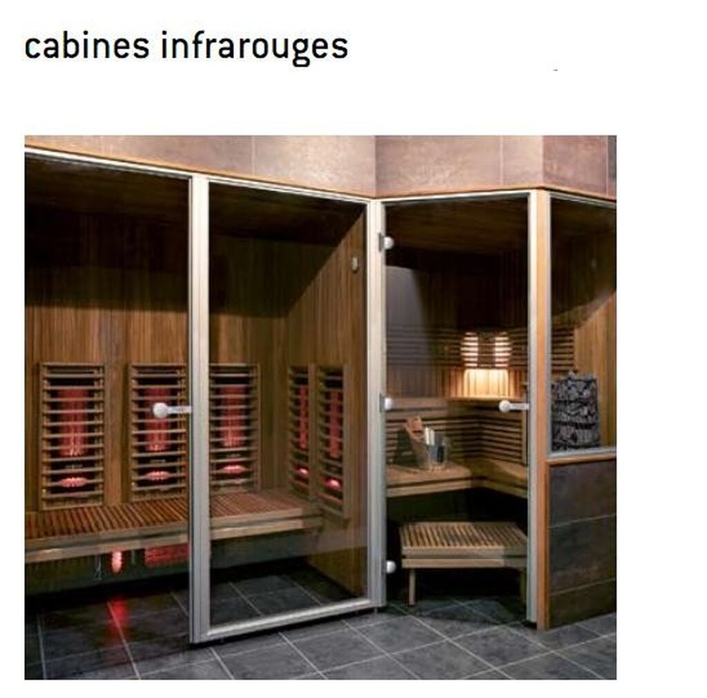 Les cabines infrarouges sont en pruche, un bois clair et dégageant une odeur agréable, apparenté au pin. Surface extérieure est du placage noyer foncé. Les cabines infrarouges sont de conception moderne et comportent de nombreuses surfaces vitrées.