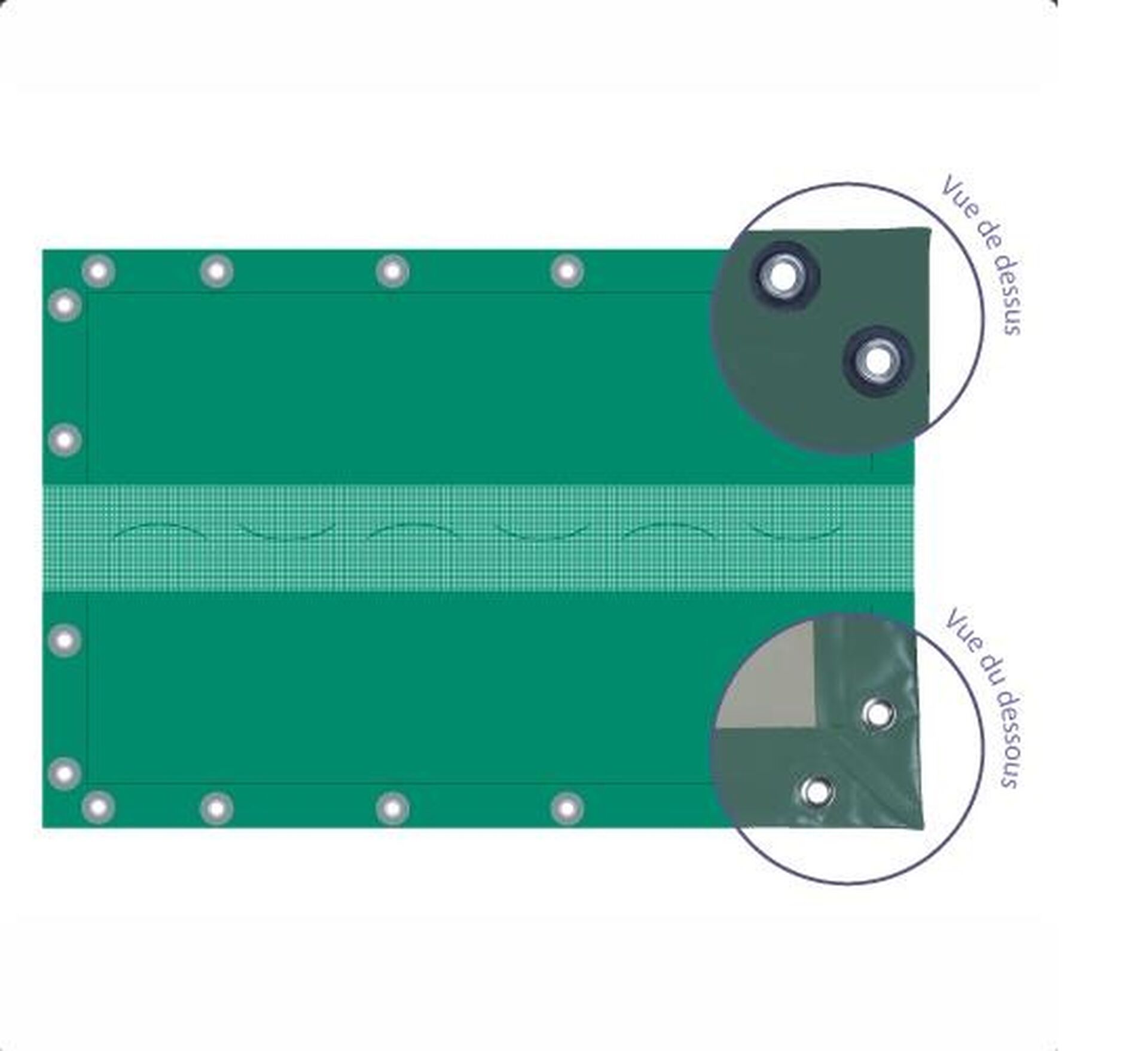 OEillets inox sur renfort PVC soudé à fer chaud = Meilleure résistance à la déchirure, accrochage plus sûr et fiable dans le temps.