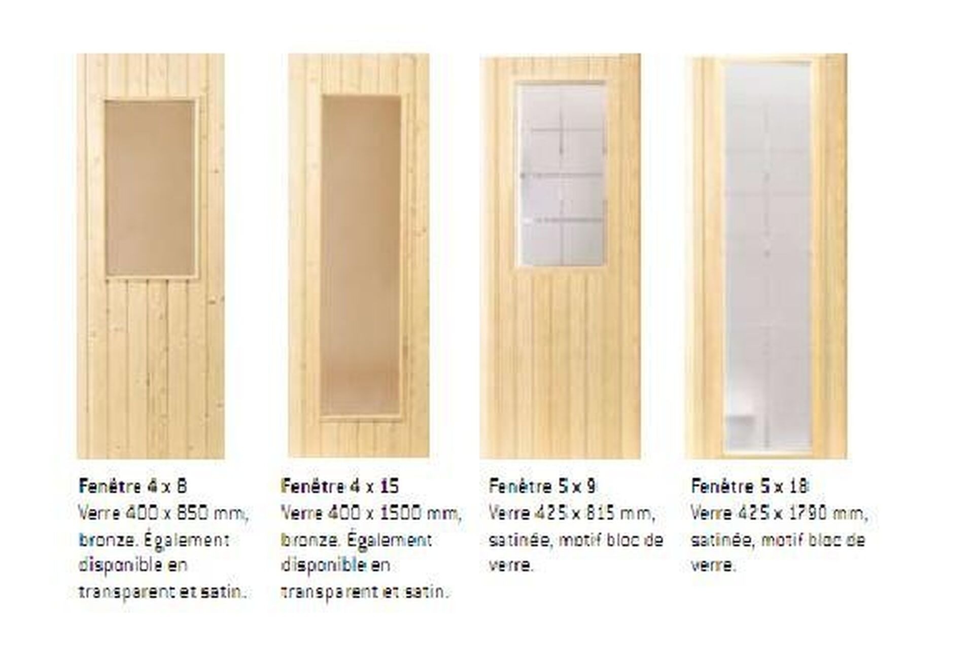 Une ou plus de fenêtres peuvent être ajoutées aux saunas Variant. Toutes les fenêtres Harvia sont en verre de sécurité de 8 mm. Les fenêtres sont disponibles dans les teintes bronze chaleureux, transparent moderne ou satin élégant. Comme tous les autres éléments de structure des saunas Harvia, les fenêtres répondent aux normes de sécurité les plus strictes.Harvia propose une nouvelle alternative aux blocs de verre : une fenêtre avec finitions satinées et motif bloc de verre.