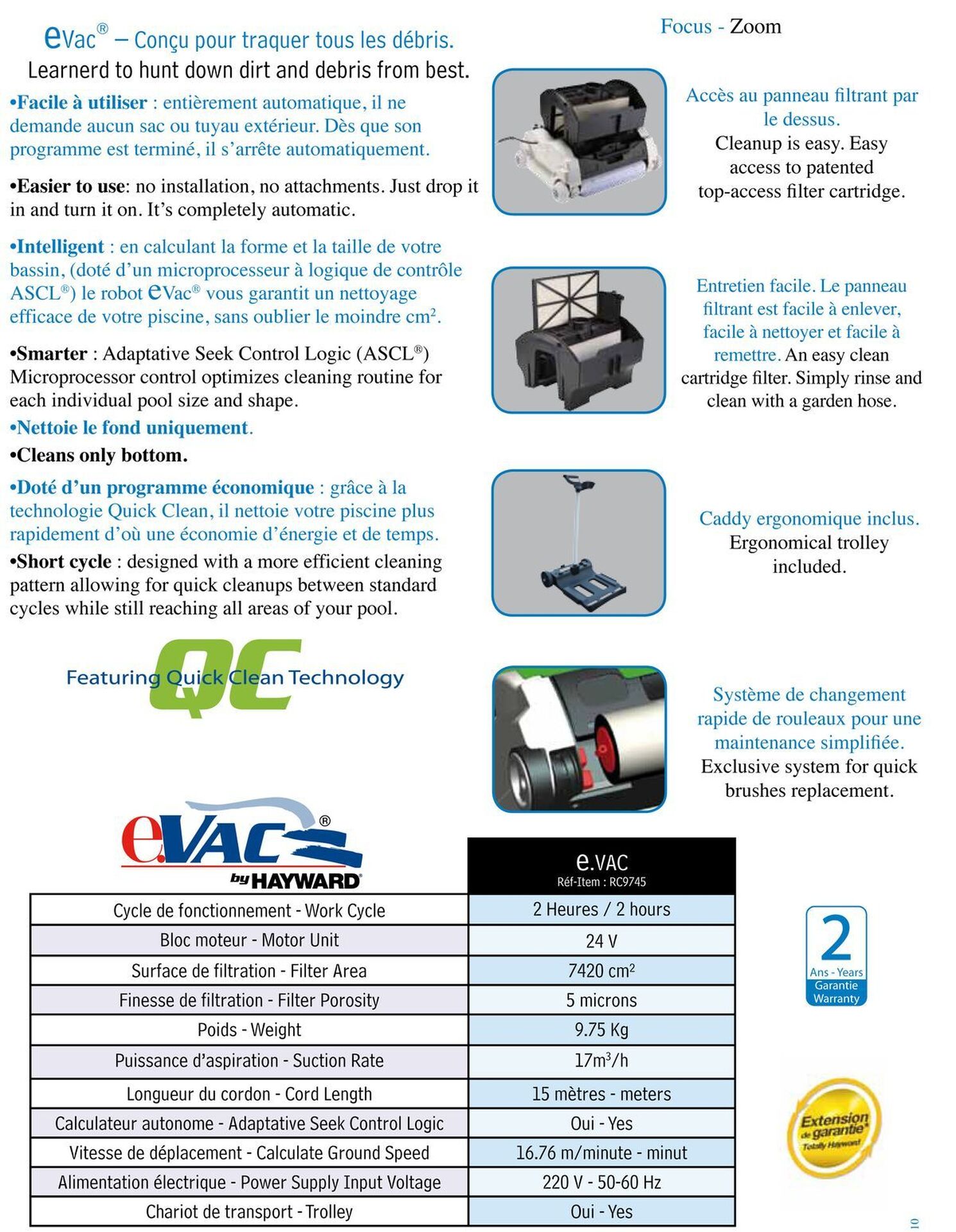 •Intelligent : en calculant la forme et la taille de votre bassin, doté d’un microprocesseur à logique de contrôle ASCL®) le robot eVac® vous garantit un nettoyage efficace de votre piscine.