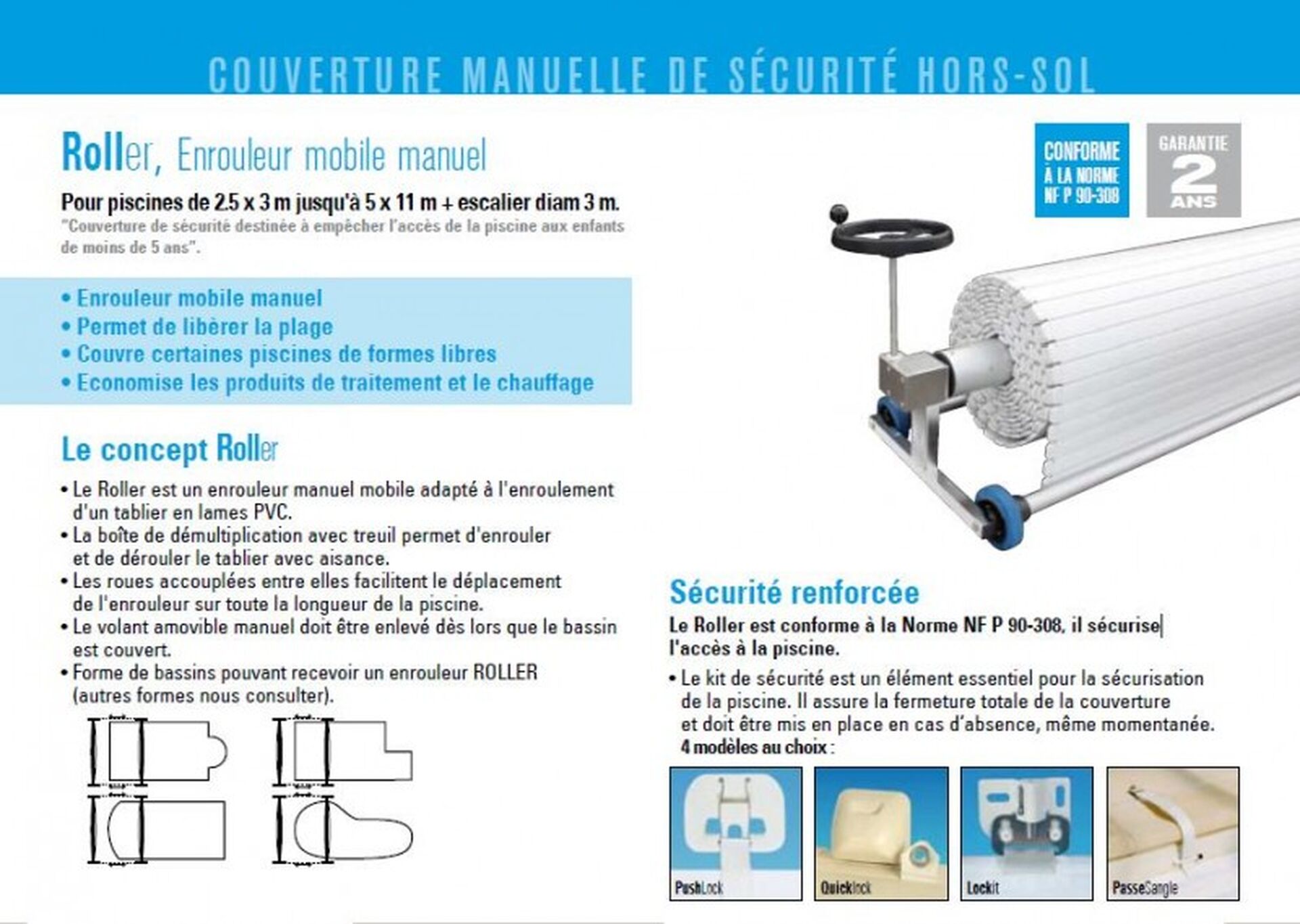 • Forme de bassins pouvant recevoir un enrouleur ROLLER